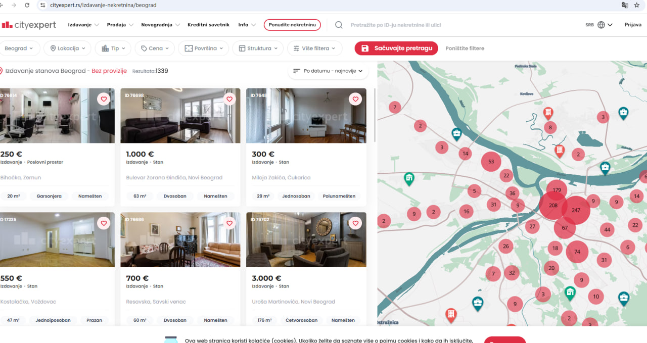 用法:访问 Halo Oglasi Nekretnine。建议使用 Chrome 浏览器自带的全页翻译,因为大部分描述是塞语。筛选条件中勾选 “Izdavanje”(出租)。如果租公寓选stan,如果租别墅,选择kuca。同时可以选择价格范围,地理位置。